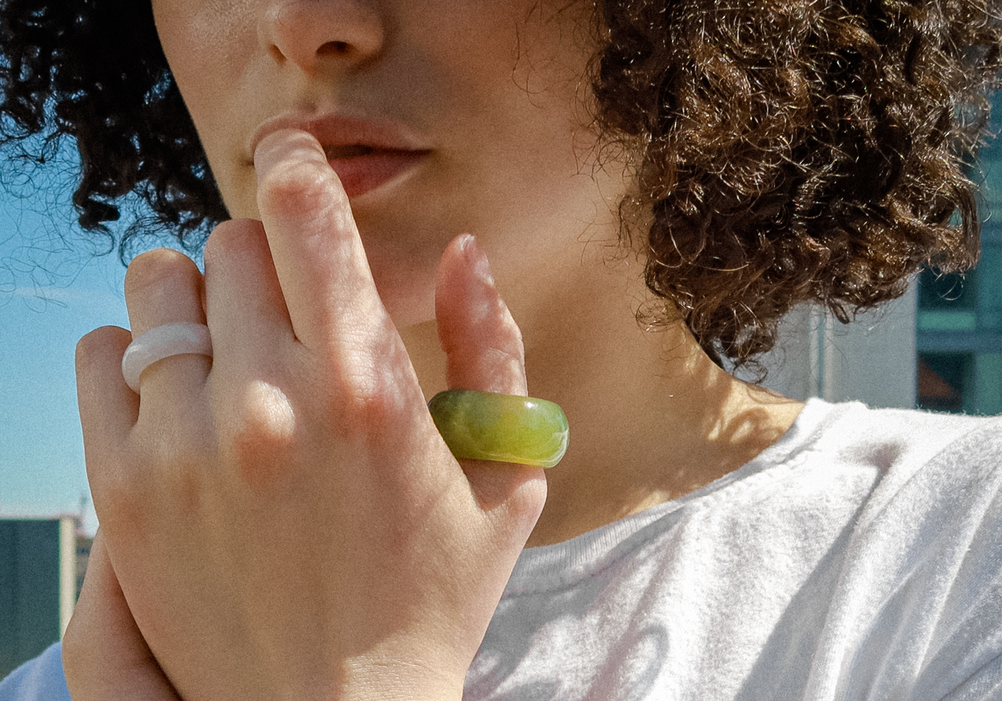 “Jade is such a lovely stone, and it comes in colors other than green! I wear the rings in various colors all over my fingers and I swear it helps my arthritis!