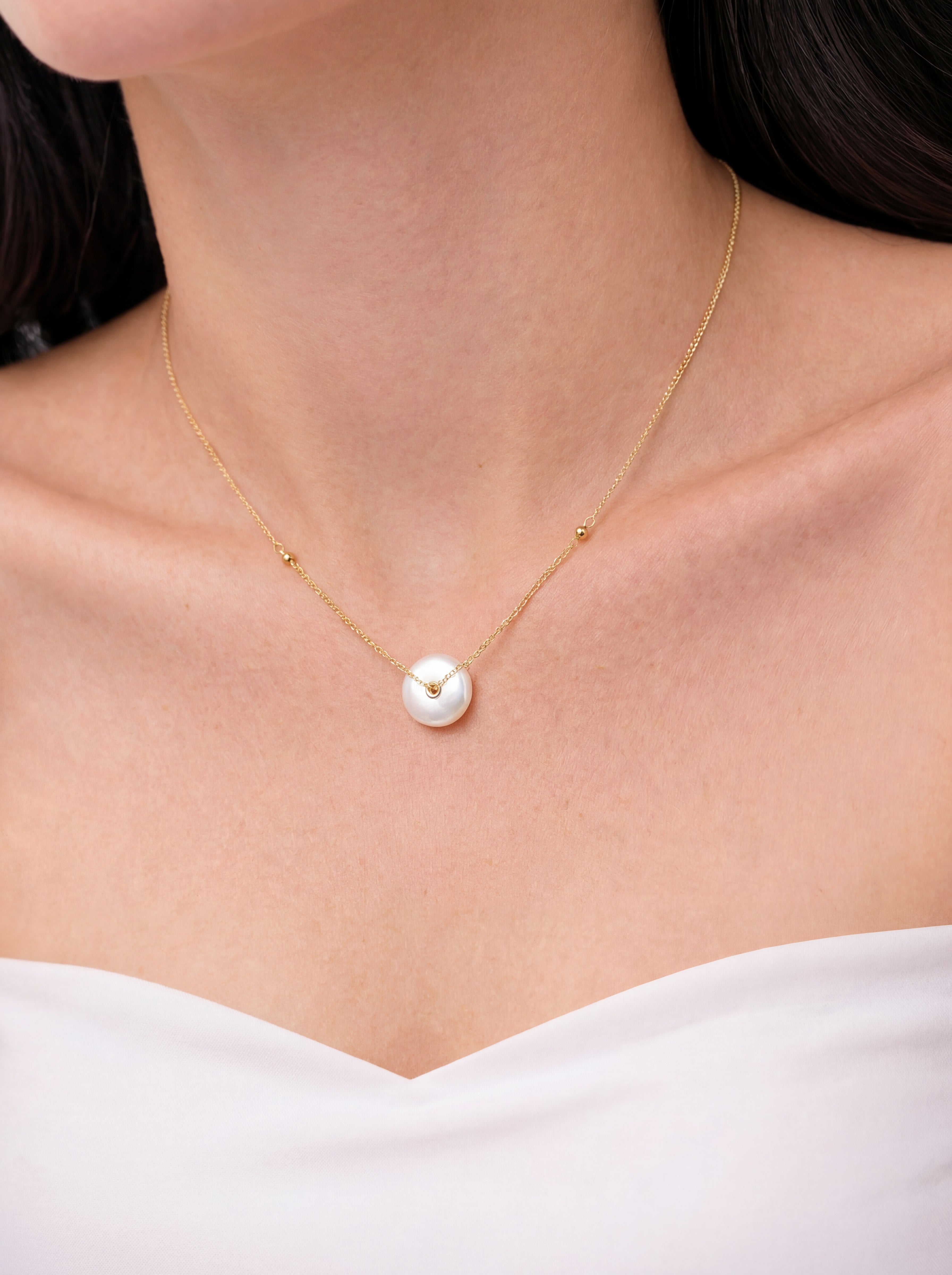 Everyday necklace featuring a button shaped freshwater pearl pendant on a 14k gold-plated chain. Put a twist on your everyday look with a dash of grace. The pendant, shaped like a button but brimming with elegance, hangs from a radiant 14k gold-plated chain for a touch of sophistication. Dress it up or down, whoever you are, whatever the day.
